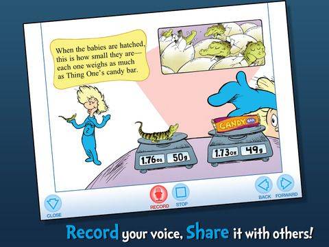 What it is/what you do with it: a set of 4 books from Cat in the Hat's Learning Library: Safari, So Good!, If I Ran the Rainforest, On Beyond Bugs and Miles and Miles of Reptiles. Each book is about 25 pages long. Two reading modes: listen to the narration and follow the text or read the story yourself (or have the story read to you by a parent). Touch the objects on pages and their name will be displayed and read out. Touch highlighted words or labels on the pictures for extra facts.