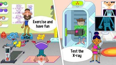 What it is and what you do with it: a role-playing doctor/hospital themed app with 8 interactive scenes: ambulance garage, reception desk, dentist office, maternity ward, hospital room, orthopedic ward, ophthalmology ward and MRI facility (plus extras like shop/pharmacy or cafeteria).