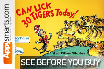 What it is: interactive versions of 3 books by dr Seuss: I Can Lick 30 Tigers Today!, King Looie Katz and The Glunk that got Thunk.